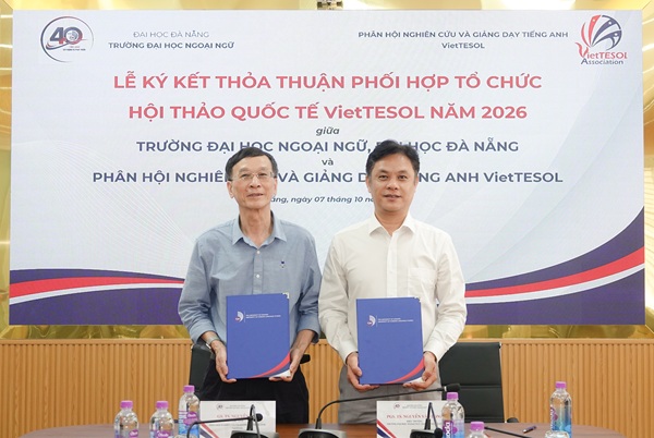 Chiều ngày 07/10/2025, tại phòng khách Trường Đại học Ngoại ngữ, Đại học Đà Nẵng đã diễn ra Lễ ký kết Biên bản thỏa thuận phối hợp tổ chức Hội thảo Quốc tế VietTESOL 2026 giữa Trường Đại học Ngoại ngữ, ĐHĐN và Phân hội Nghiên cứu và Giảng dạy tiếng Anh VietTESOL. Tham dự buổi lễ có Ban Giám hiệu Nhà trường, đại diện các Khoa, Phòng cùng lãnh đạo Phân hội VietTESOL.