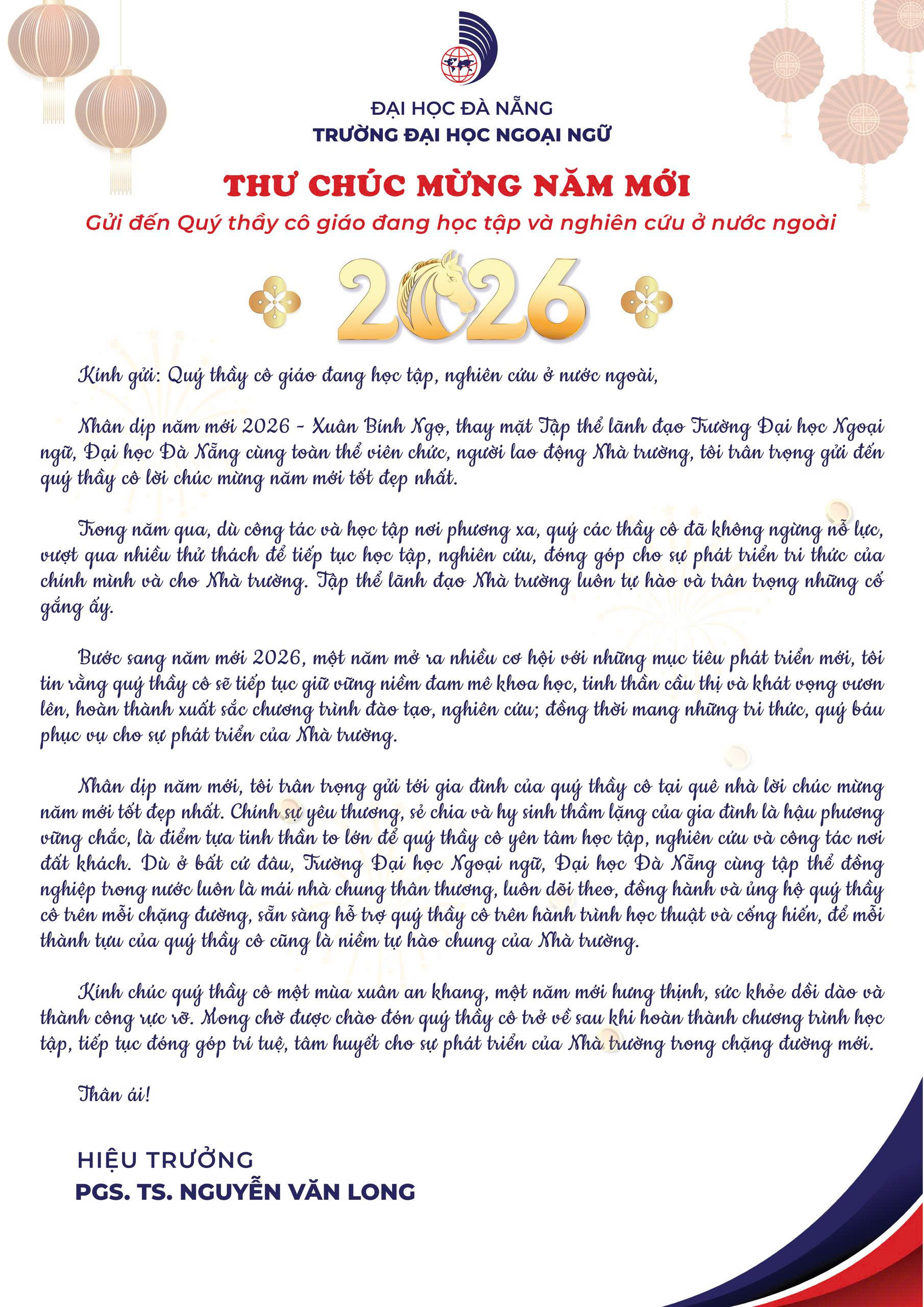 Thư Chúc mừng Năm mới 2026 của Thầy Hiệu trưởng Trường Đại học Ngoại ngữ, ĐHĐN gửi đến Quý thầy cô giáo đang học tập và nghiên cứu ở nước ngoài.