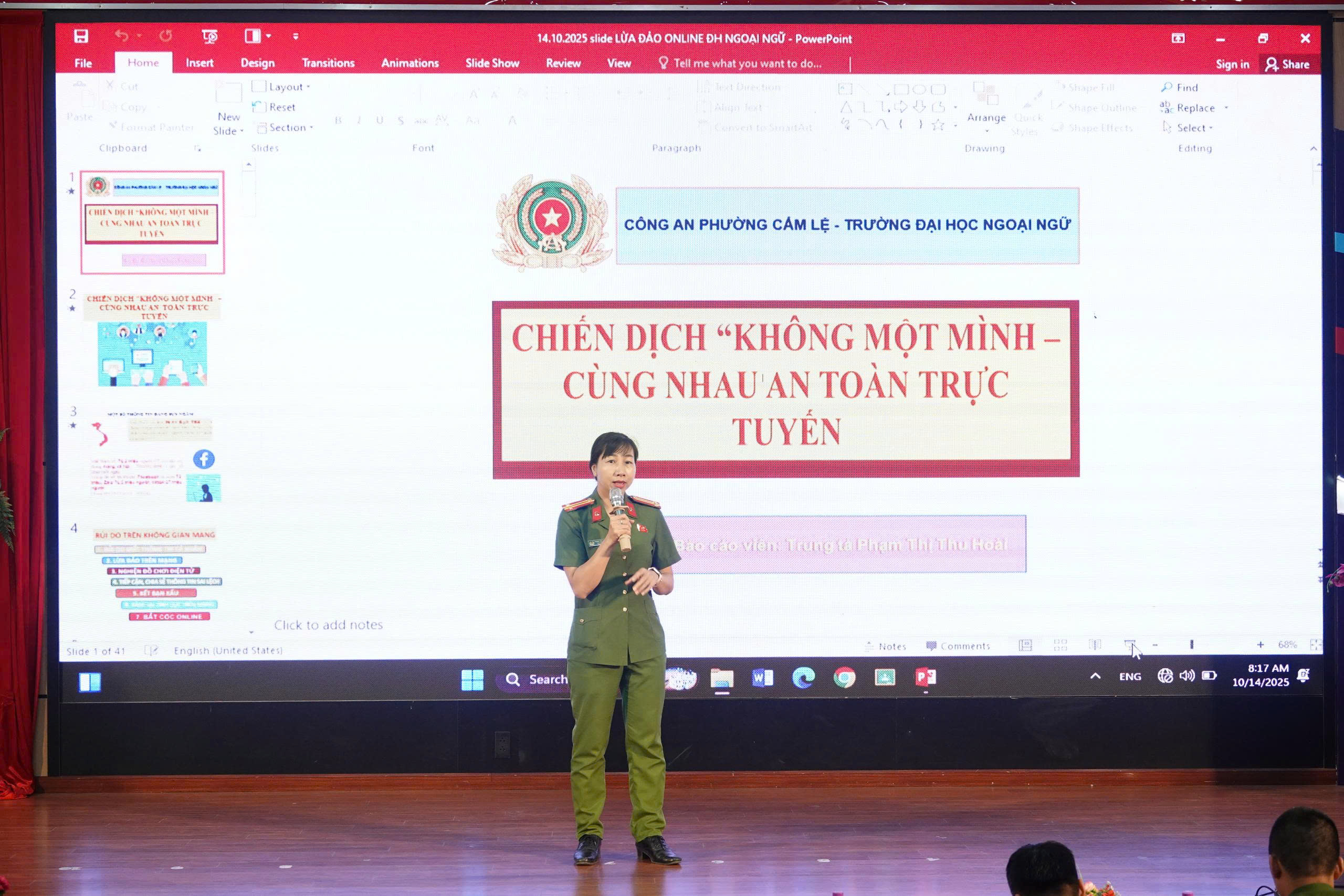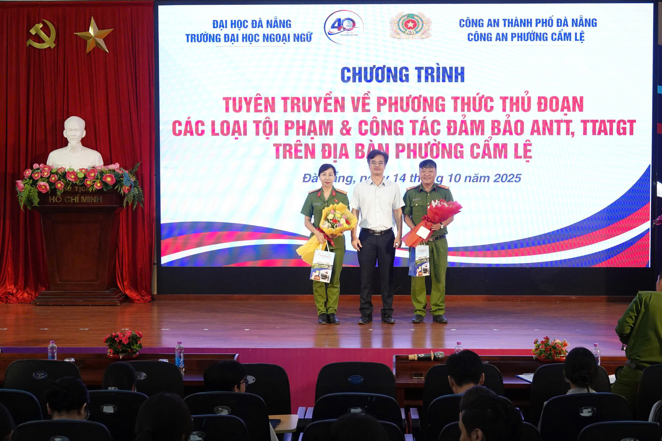 Ngày 14/10/2025, tại Hội trường A, Trường Đại học Ngoại ngữ, Đại học Đà Nẵng phối hợp với Công an phường Cẩm Lệ tổ chức Chương trình tuyên truyền về an ninh, trật tự trường học. Hoạt động nhằm trang bị cho sinh viên những kiến thức và kỹ năng cần thiết để nhận diện, phòng tránh các nguy cơ tội phạm học đường như tín dụng đen, lừa đảo công nghệ cao, trộm cắp tài sản và nhiều hình thức vi phạm tinh vi khác đang có xu hướng gia tăng trong đời sống sinh viên.