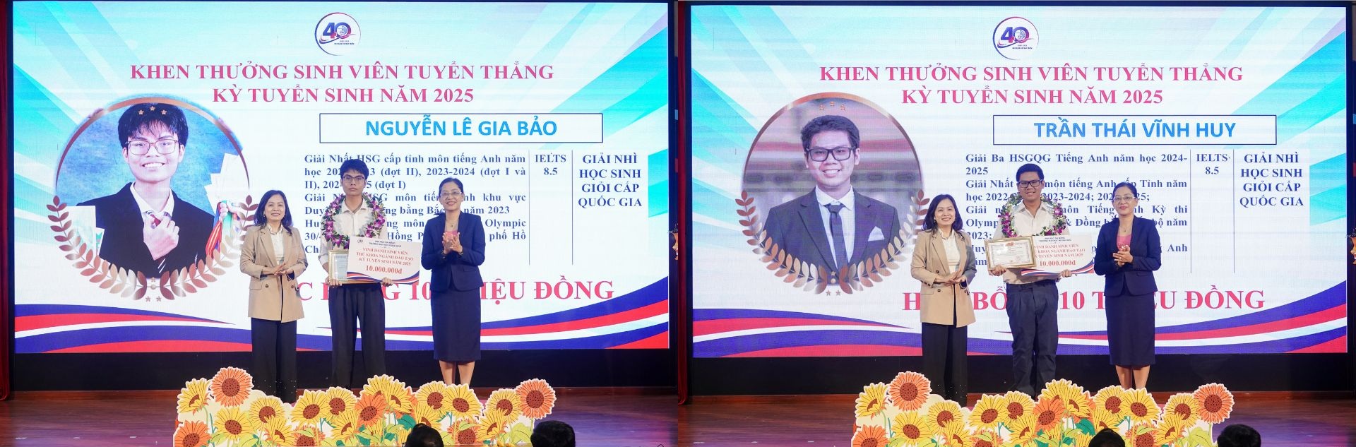 Năm nay, Nhà trường đã trao nhiều suất học bổng có giá trị: 20 triệu đồng cho thủ khoa toàn trường, 10 triệu đồng cho thủ khoa các ngành và sinh viên tuyển thẳng cùng 60 suất học bổng “Nâng bước sinh viên” với tổng giá trị 300 triệu đồng. Đặc biệt, chương trình còn chào đón 12 lưu học sinh quốc tế, khẳng định môi trường học tập đa văn hóa, hiện đại và hội nhập quốc tế của Trường Đại học Ngoại ngữ, Đại học Đà Nẵng.